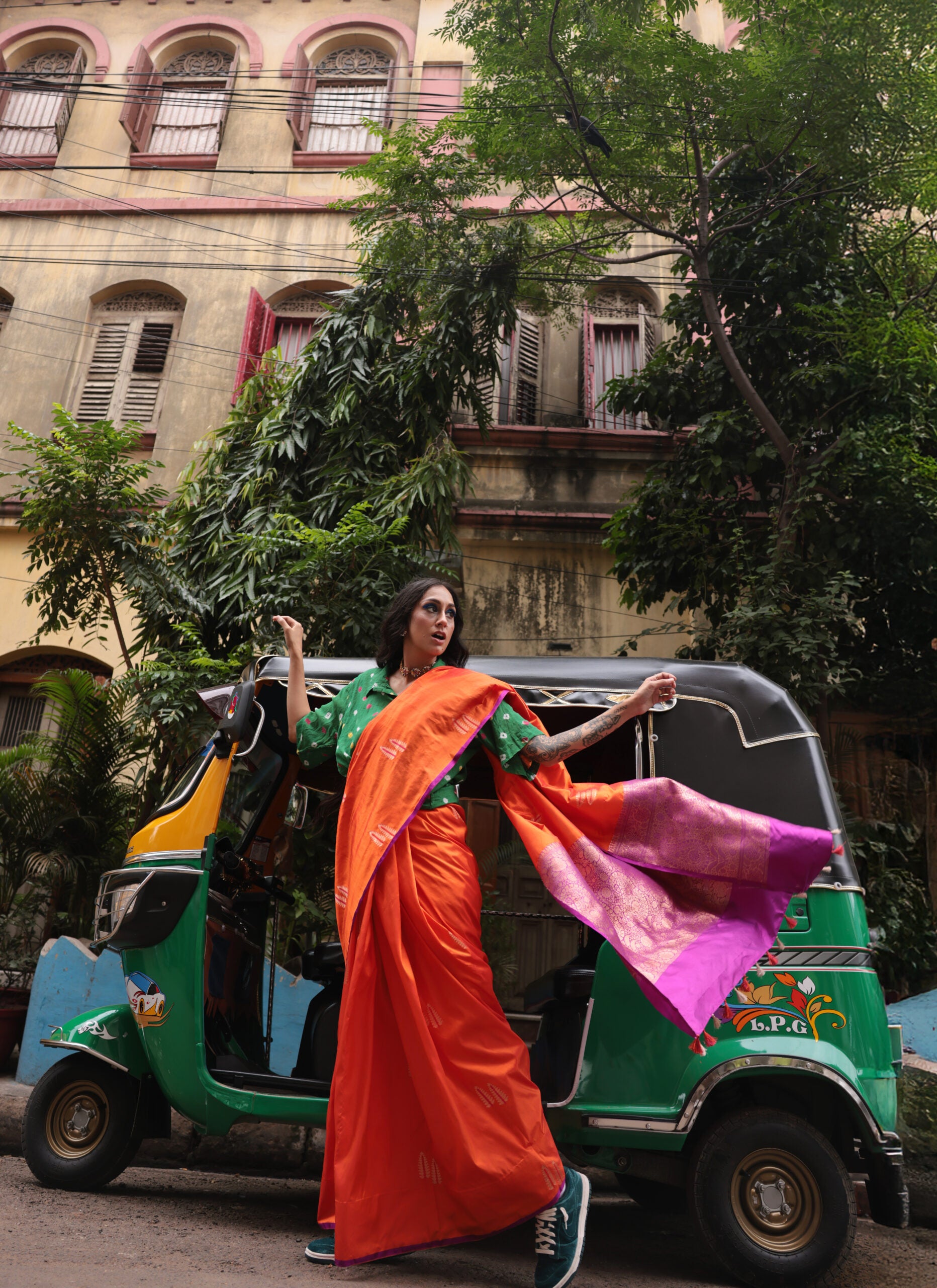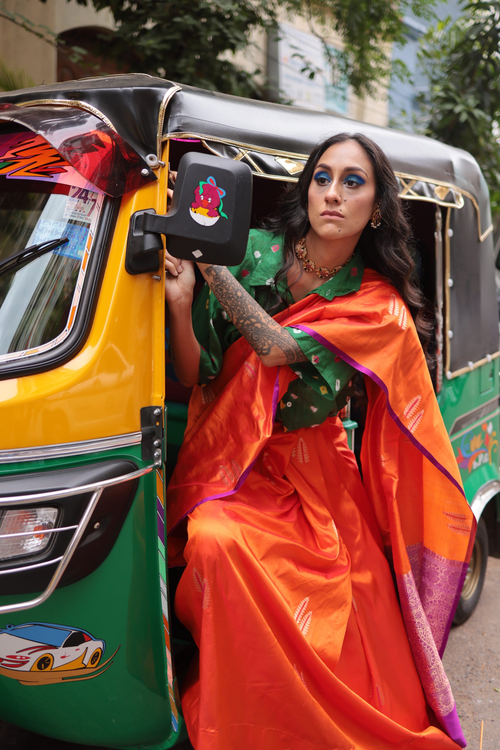 A radiant Pure Katan Silk saree, handwoven without borders and detailed with the intricate Kadhua meenakari buta , every thread speaks of heritage, but with a modern rhythm.