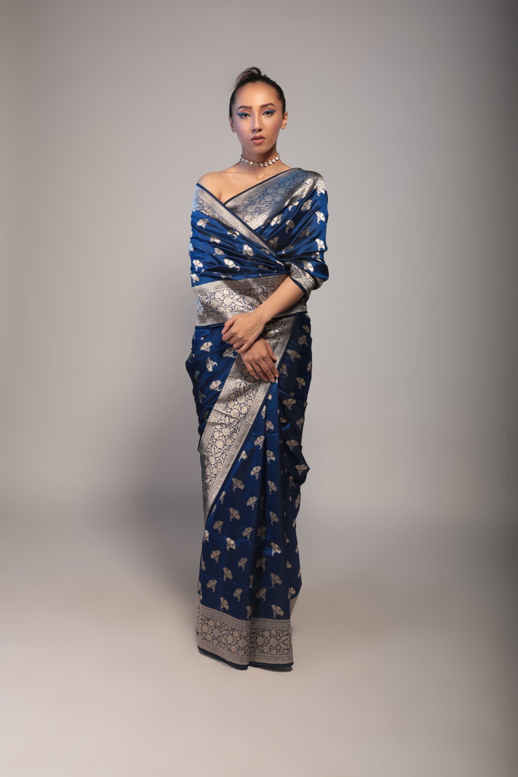 This is an exclusive blue handcrafted pure Katan silk Benarasi saree. The beautiful muted gold zari Daffodil butas spanning the entire saree gives a very edgy and royal look . This saree could count as both, a contemporary piece or an indigenous classic to be treasured in your wardrobe.