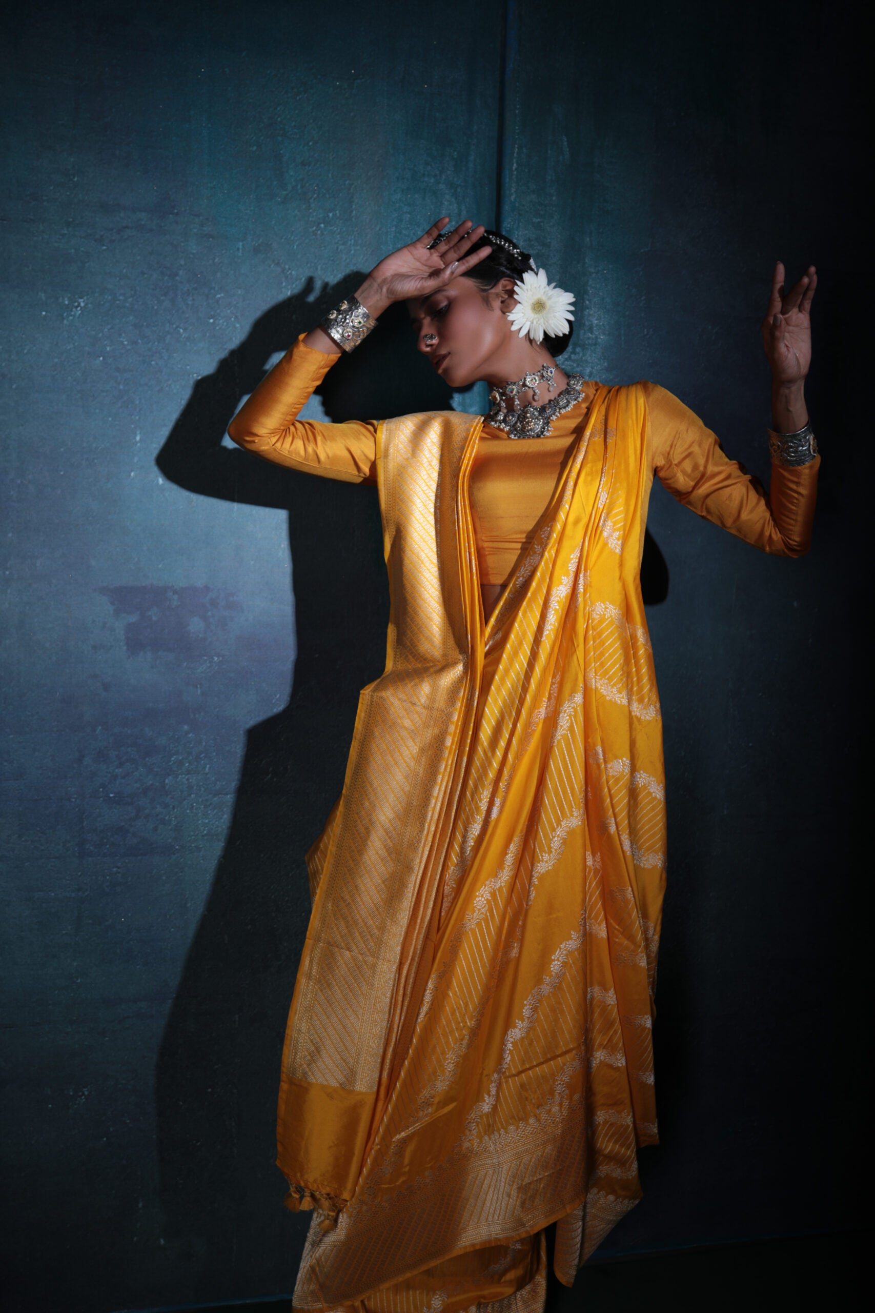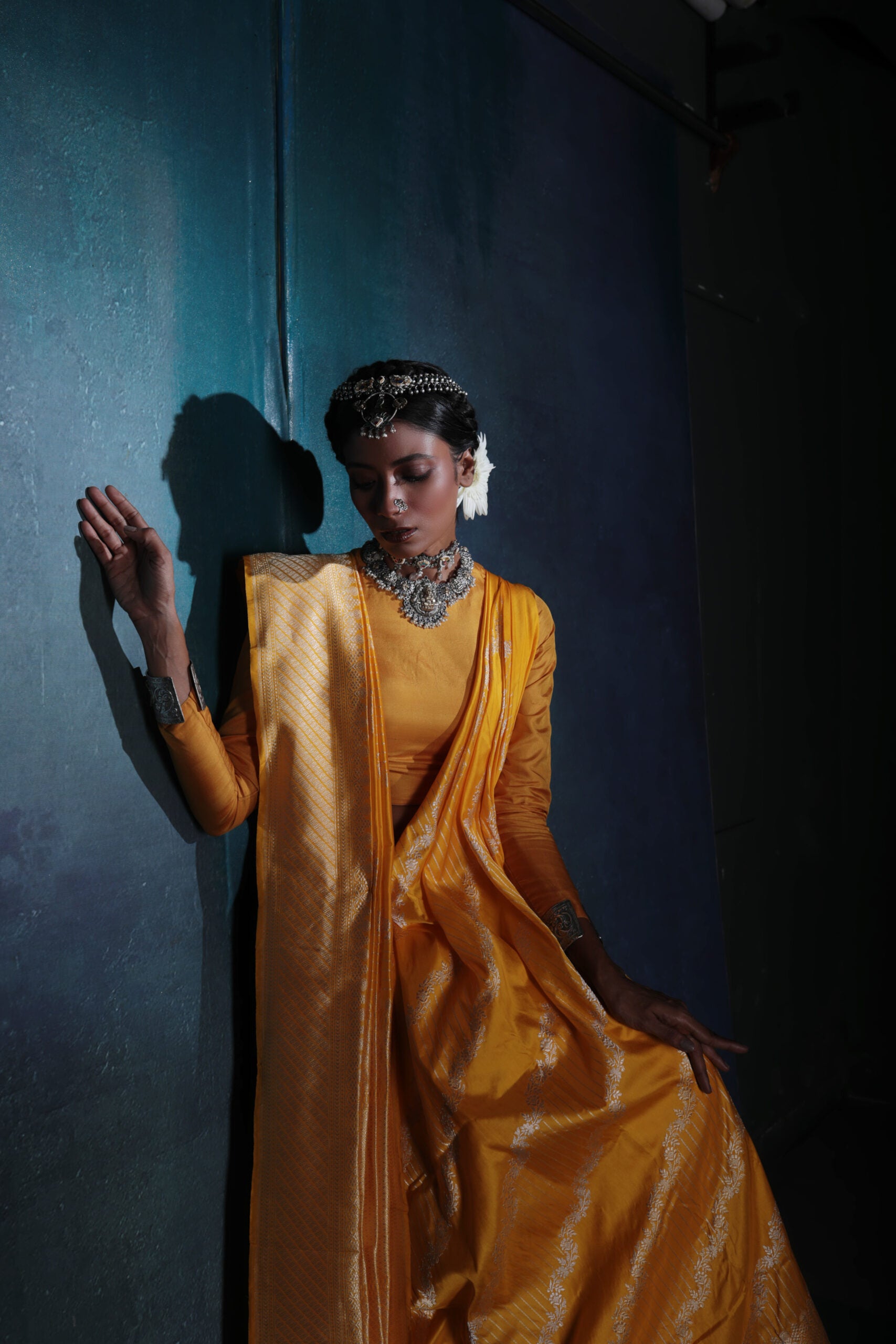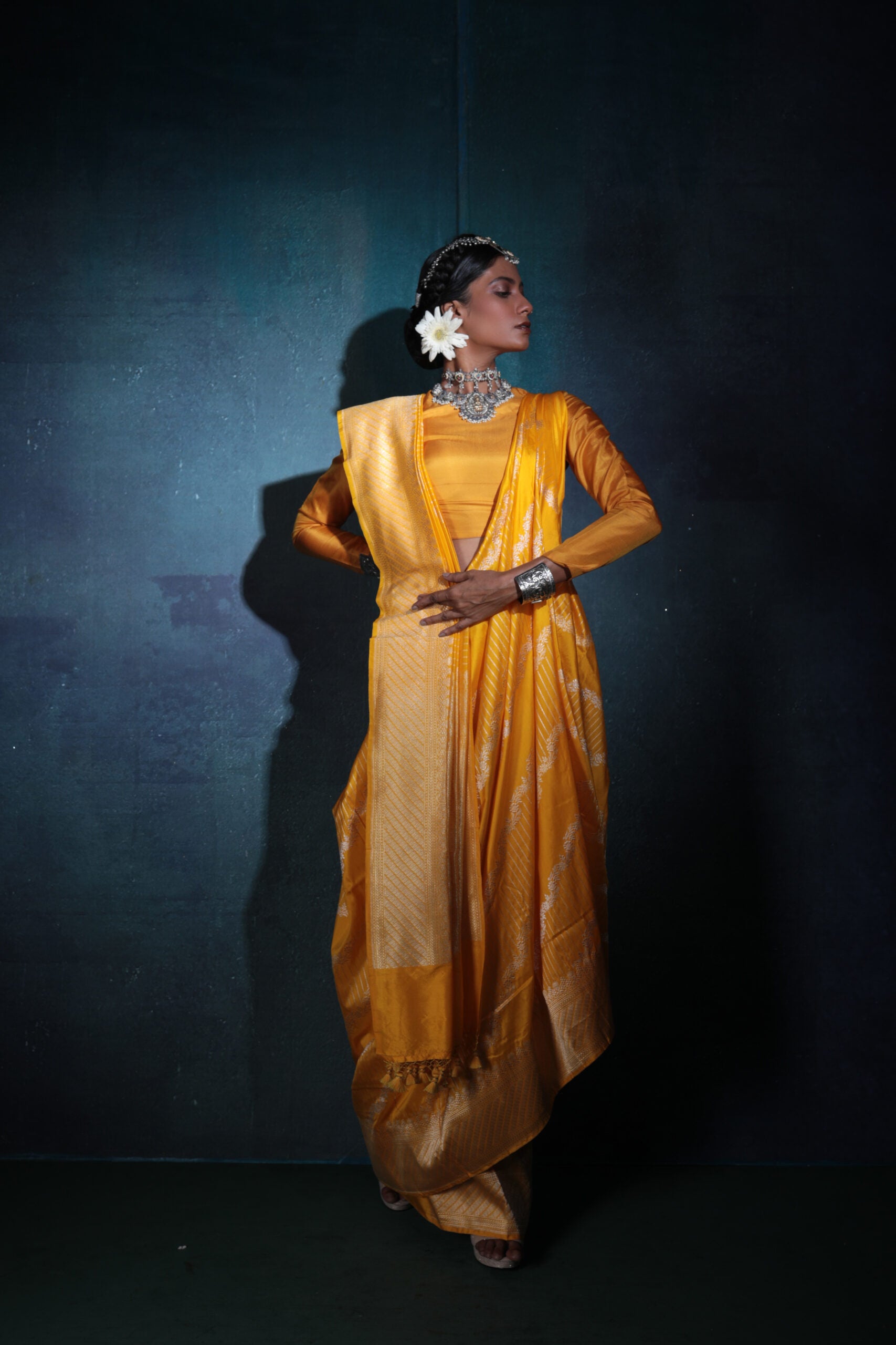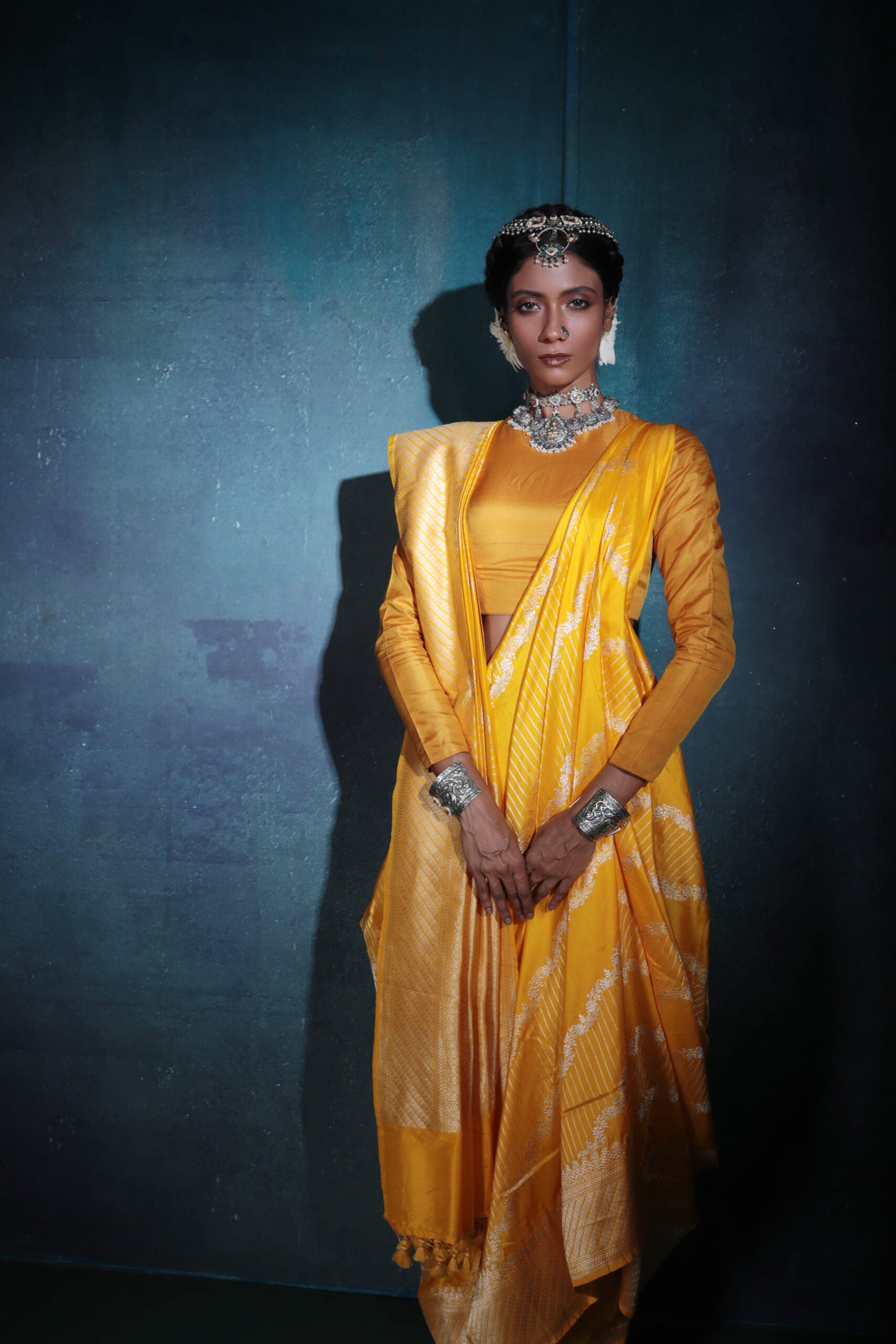 This gorgeous yellow Jungla Banarasi Saree, adorned with a muted gold leheriya weave, exudes timeless elegance. This exquisite piece weaves together tradition and sophistication, creating a graceful dance of yellow hues and subtle gold accents. The jungla pattern adds a touch of nature’s beauty, while the muted leheriya weave brings a refined charm. Wrapped in this saree, one embodies the fusion of classic Banarasi craftsmanship with the subtle allure of muted gold, making a statement that resonates with sophistication.