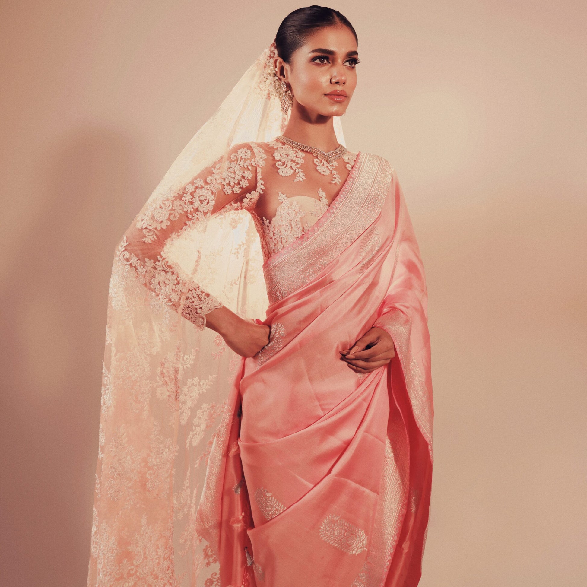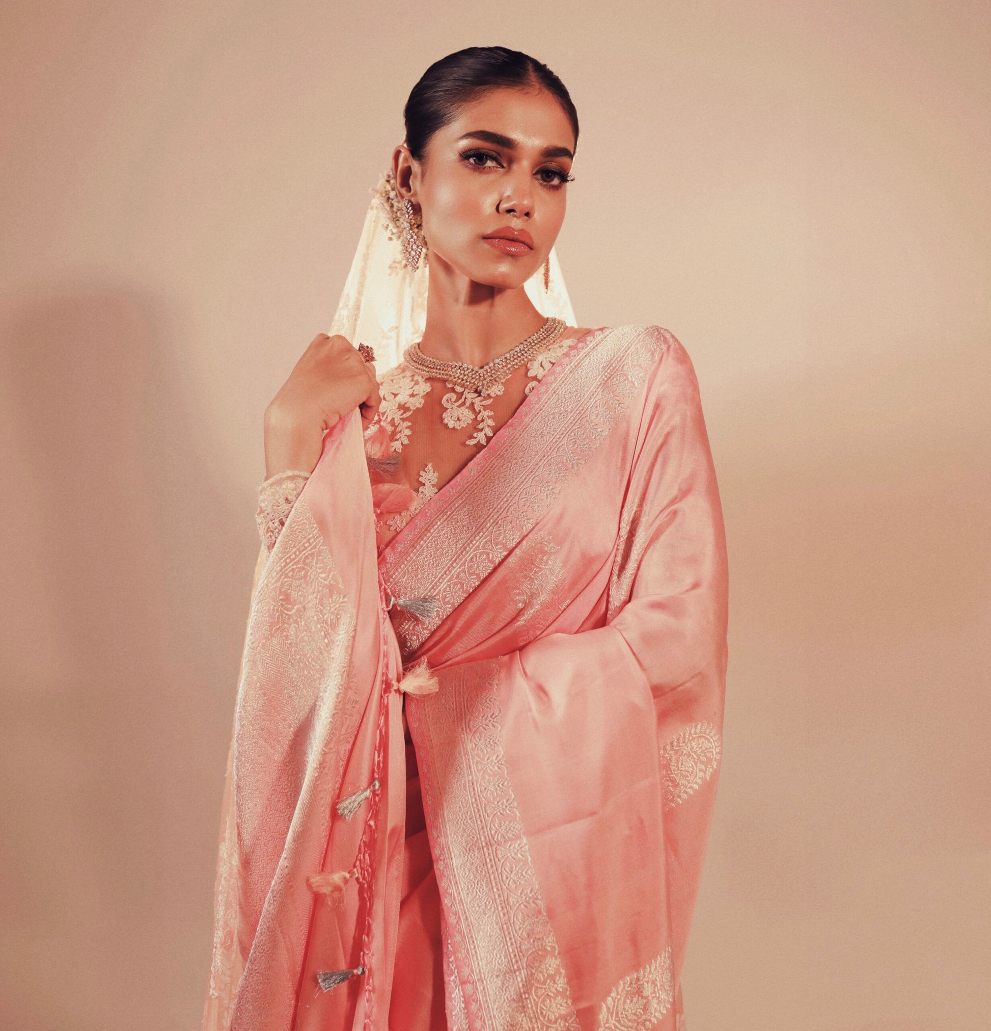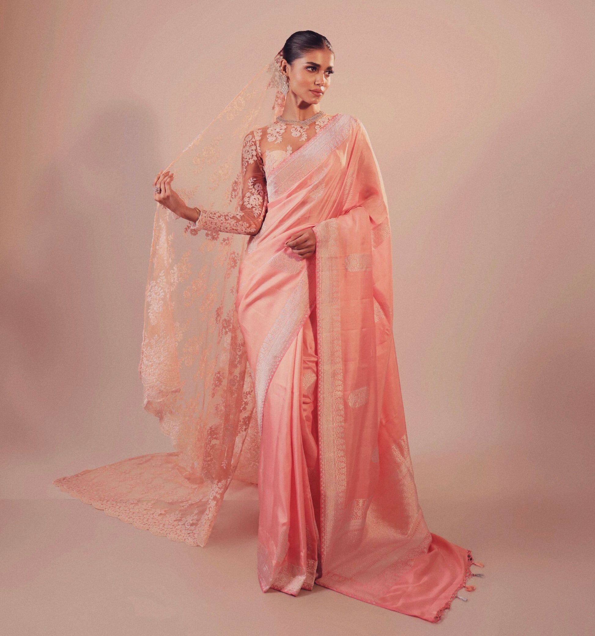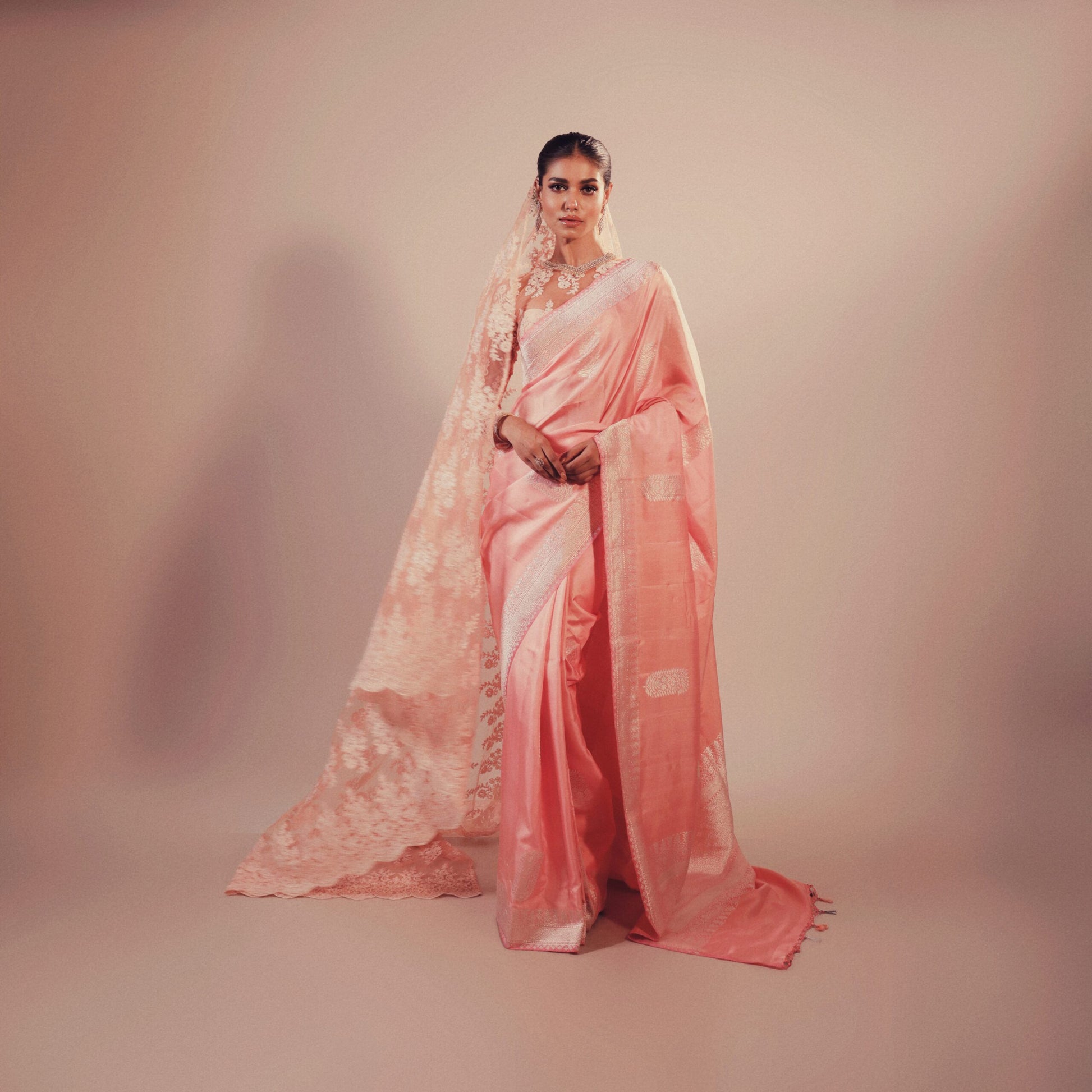 Tradition, elegance, and modernity intertwined. Presenting Ira by Mitan Ghosh Designs - a mesmerizing blend of pastel hues and cultural harmony. Draped in a soft peachy pink Sona Rupa Kadhua Benarasi saree. A creation redefines bridal fashion with a contemporary twist. Designed for pastel weddings, it celebrates the bride who radiates grace and timeless sophistication.
