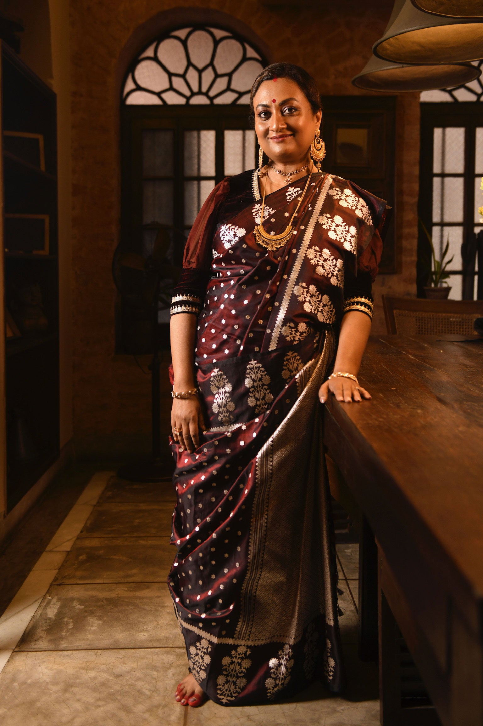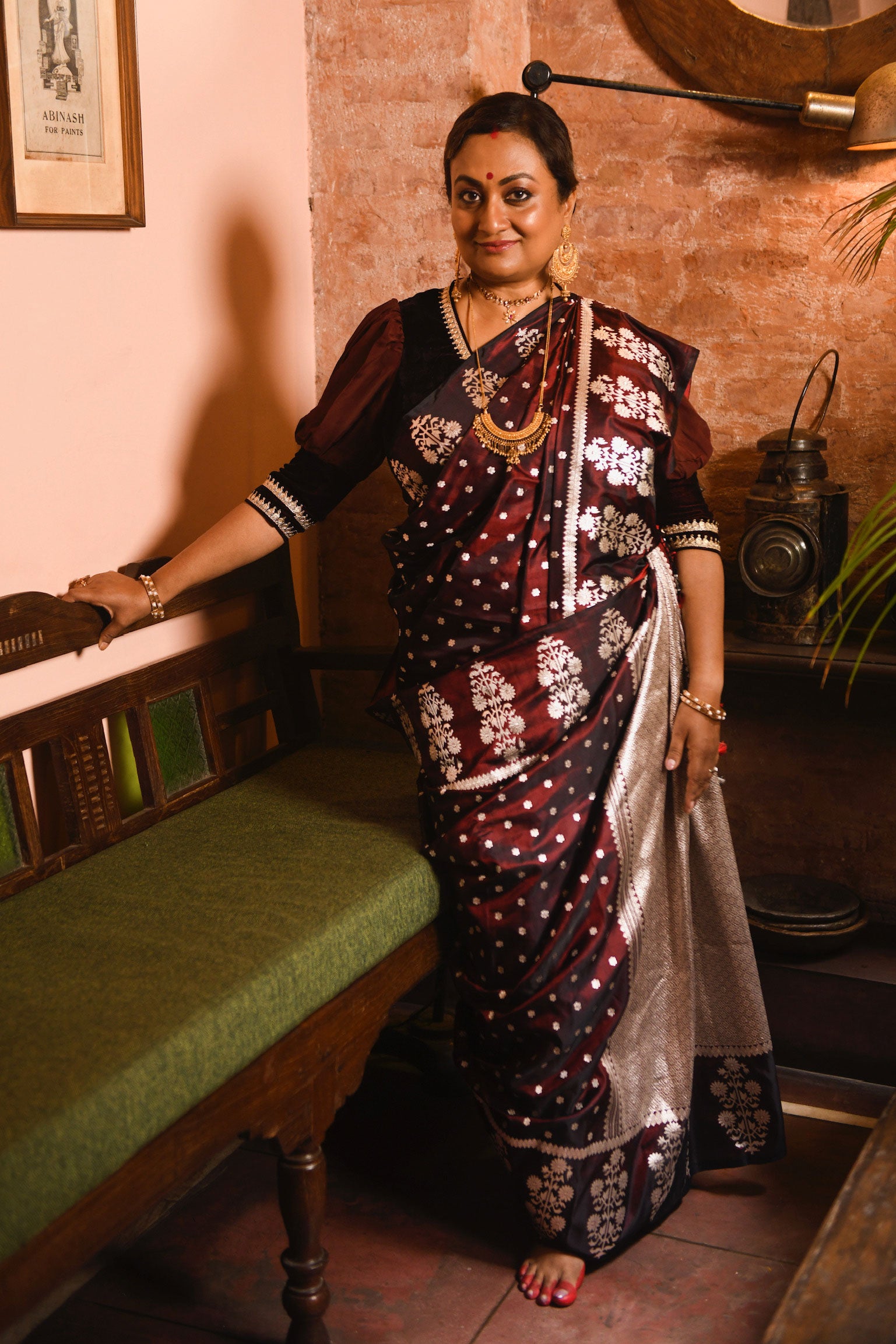100 percent handwoven, this saree is a sui generis in the creed of benarasis. To start off, the shot wine and maroon colour palette of this saree gives it a unique glow. While the saree gleams in a bright near to rustish hue in the morning light, it radiates a sombre, dignified maroon red by the night.