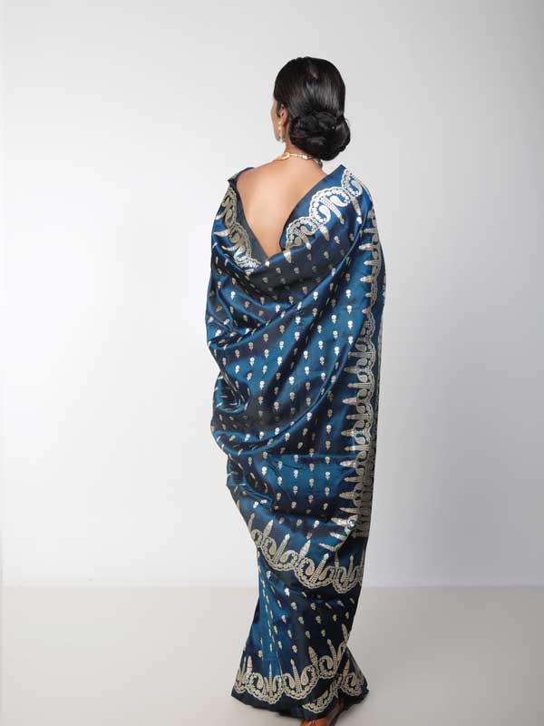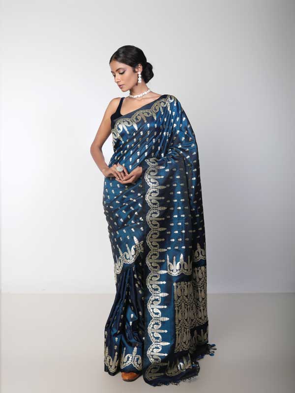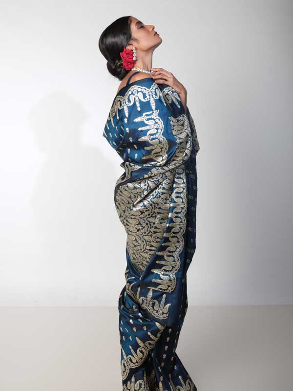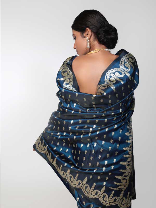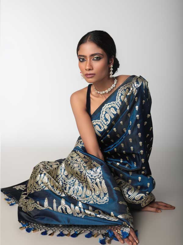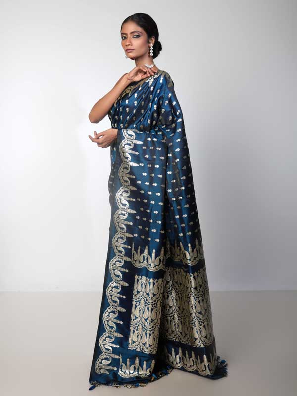 Authentic handwoven Mashru Silk, Neelaja can be safely sorted out as the princess of Benarasis. Its dark and chic base, made out of shiniest sombre blue satin thread lends it the much needed royalty to be picked as an emblem of royalty. Further its woven brazen golden work of Mughal Paisleys all over the body adds to the regalia of of this 6 yard beauty.