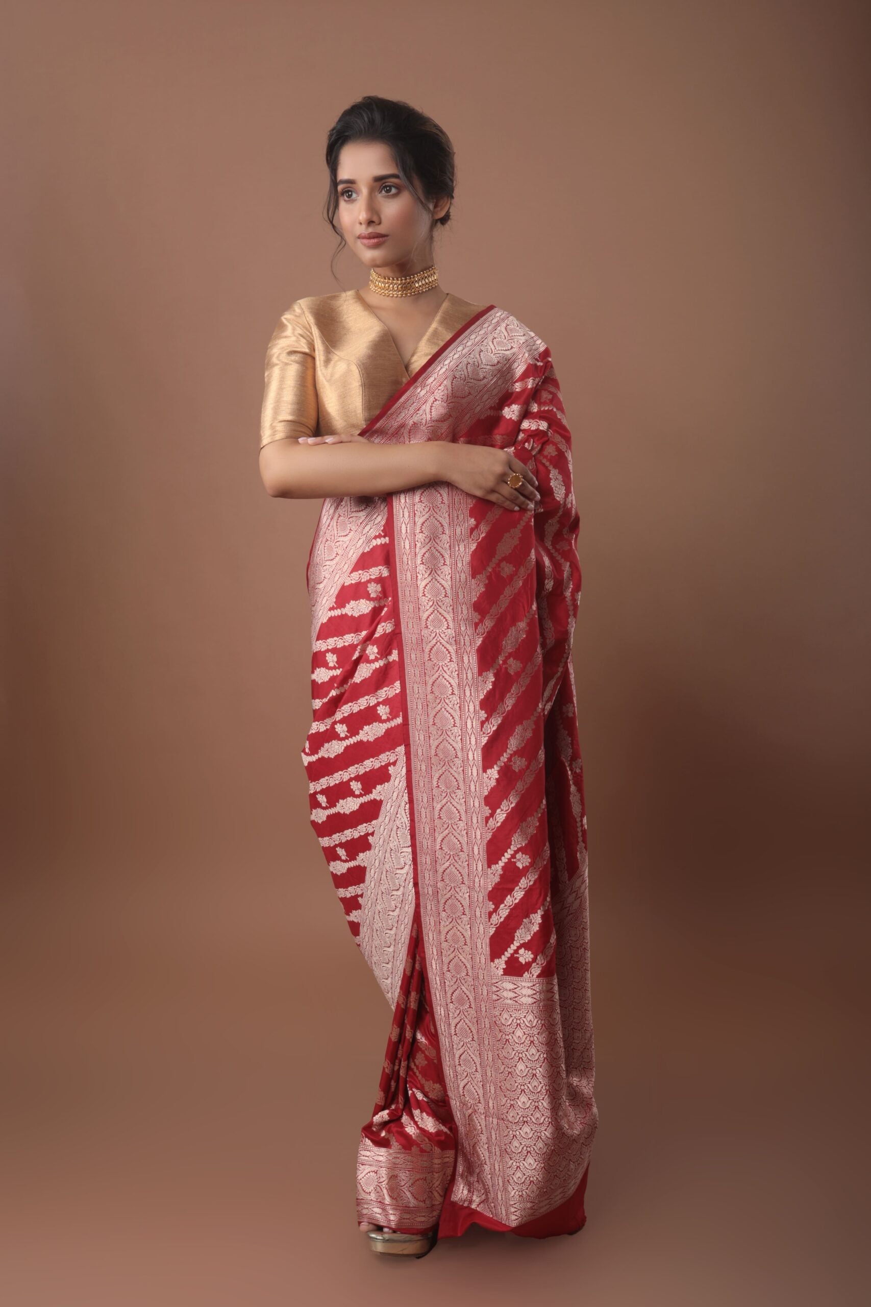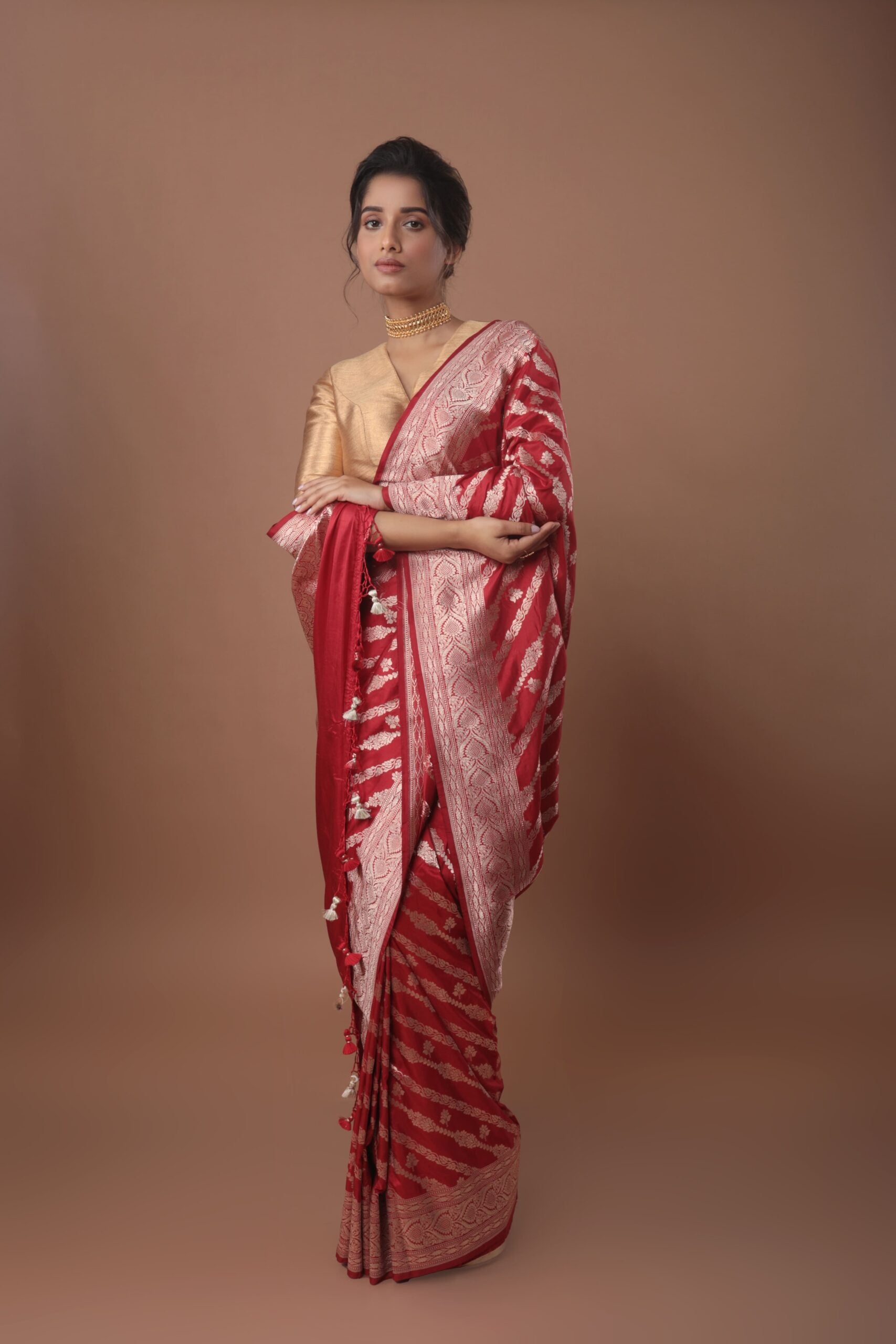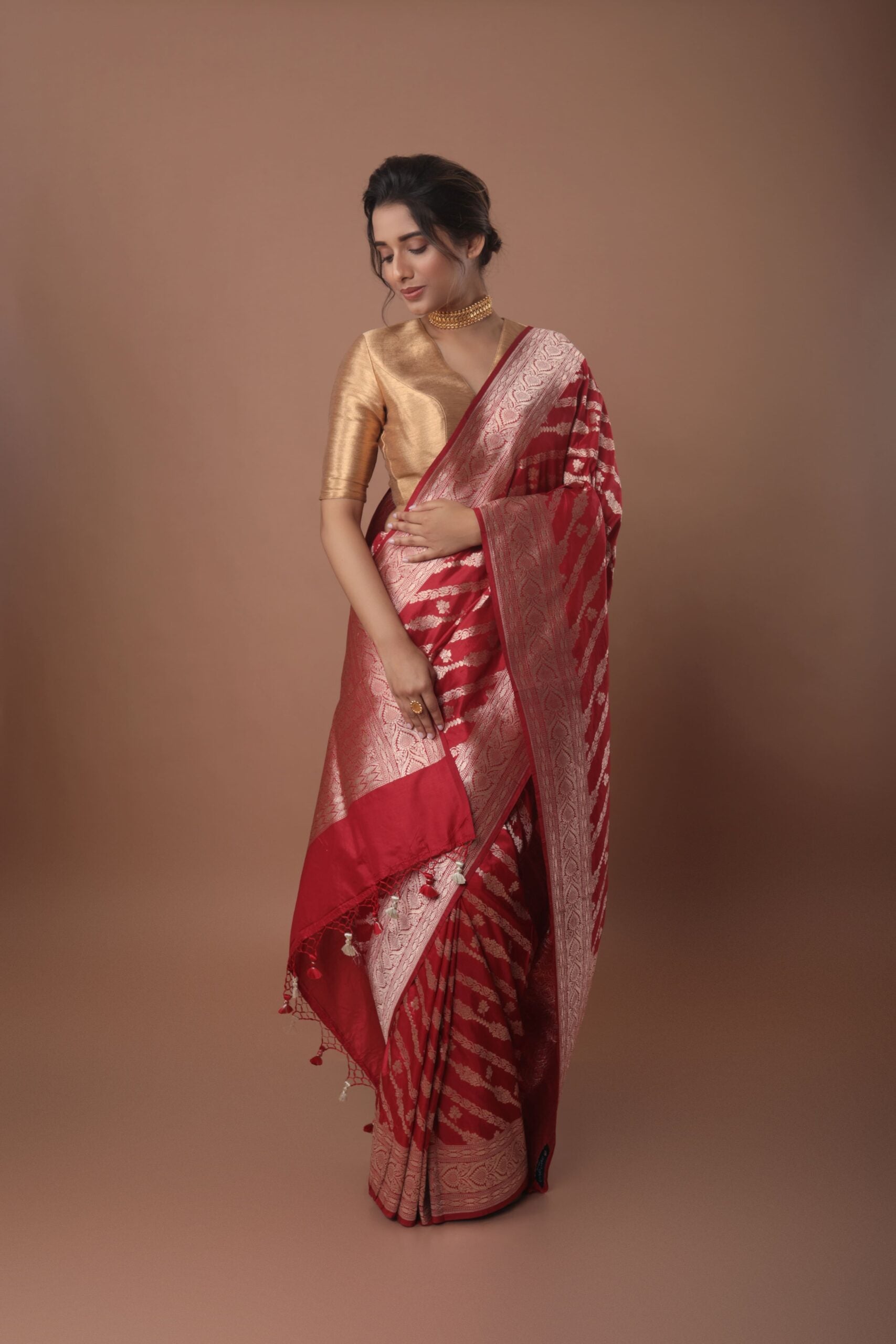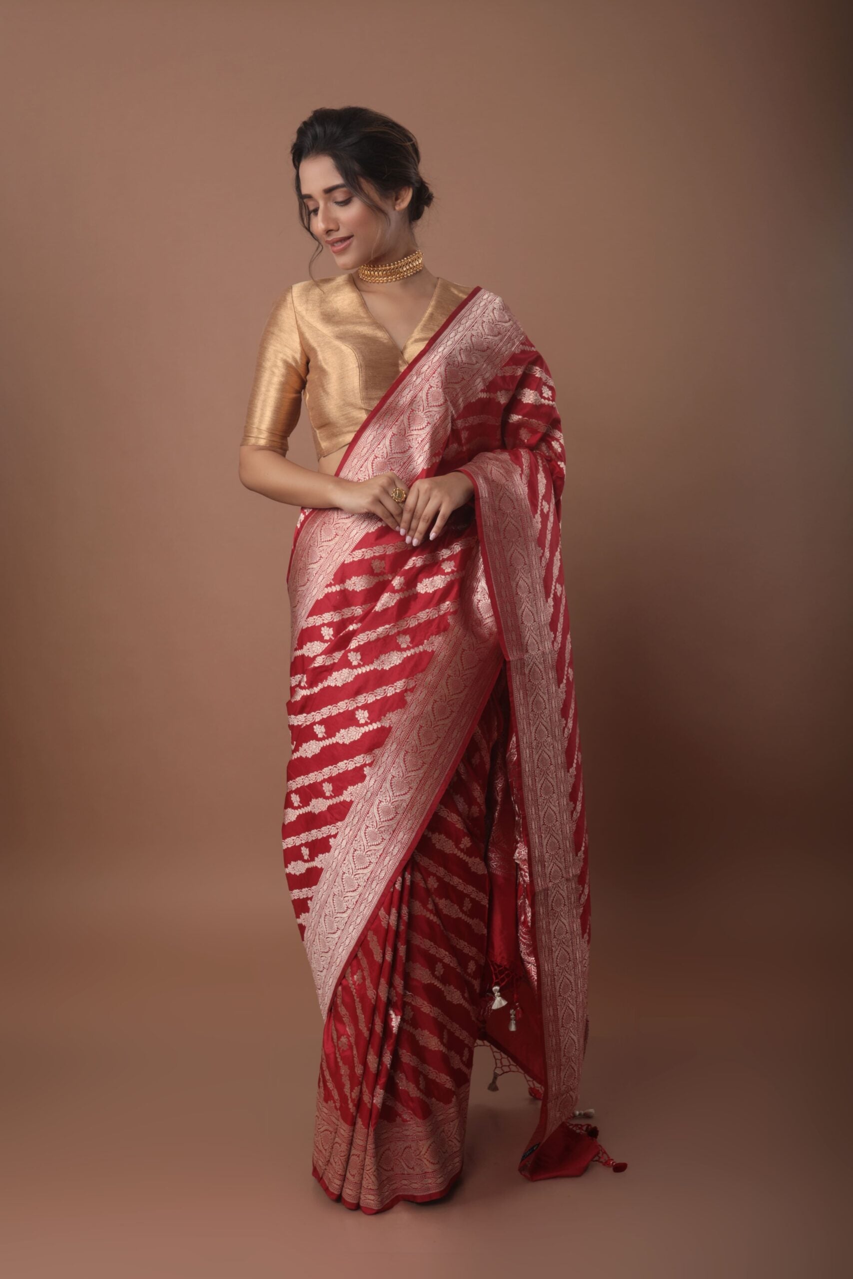 Introducing a captivating red saree, meticulously handwoven from the finest Katan silk Benarasi, boasting a mesmerizing muted gold zari leheriya weave. This exquisite piece exudes a timeless charm, with each intricate detail crafted to perfection. The leheriya pattern adds depth and dimension to the rich red hue, creating a stunning visual effect that is both traditional and contemporary. Dress to impress in this elegant saree, a true testament to the artistry and craftsmanship of Benarasi weavers.