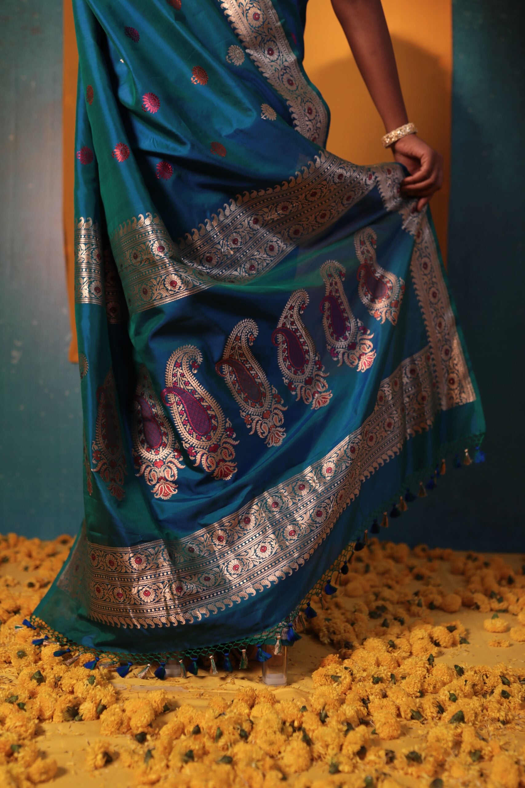 Rupanjana by Mitan Ghosh Designs: a masterpiece of pure handwoven Kadhua Benarasi, adorned with delicate meenakari details that bring each motif to life. This saree is a celebration of heritage, weaving traditions, and timeless elegance, making it the perfect choice for those unforgettable moments. Step into grace, wrapped in a legacy that’s as rich and beautiful as the occasion itself.