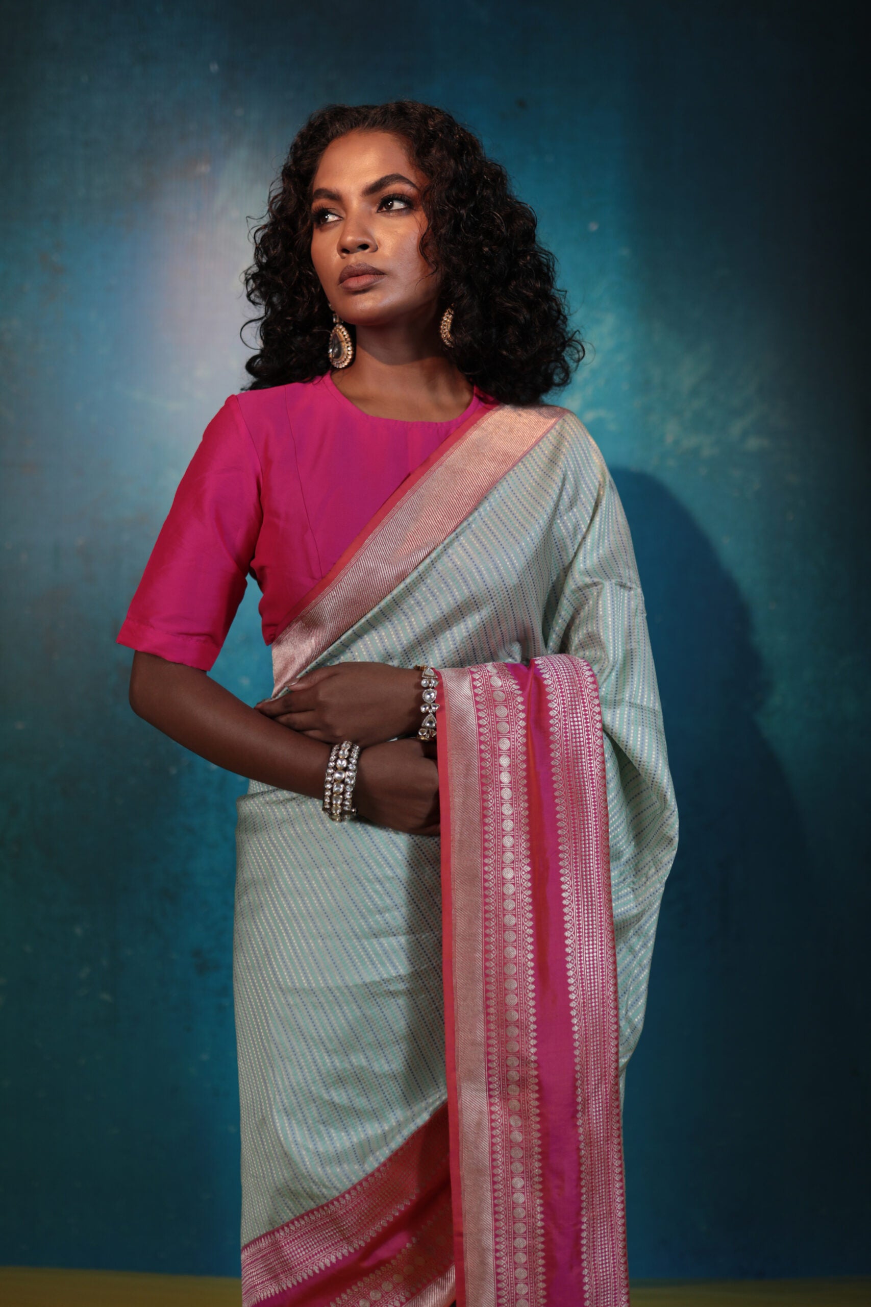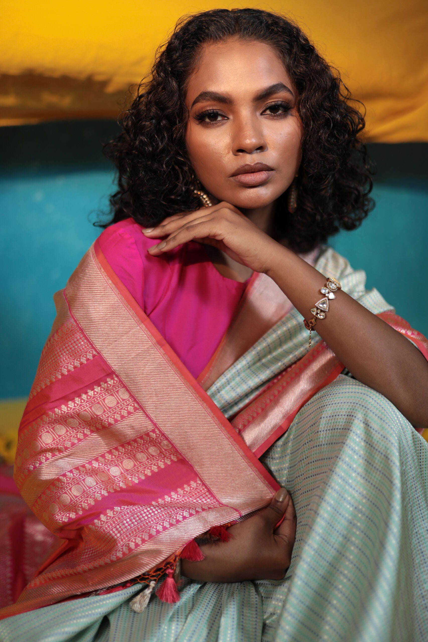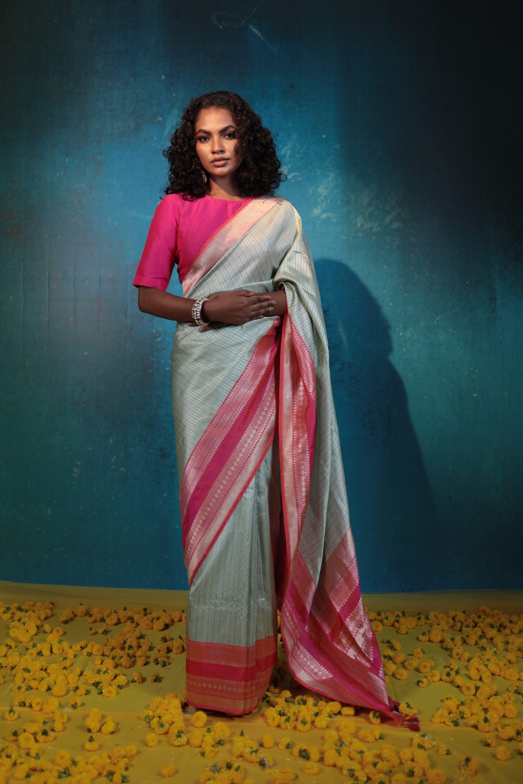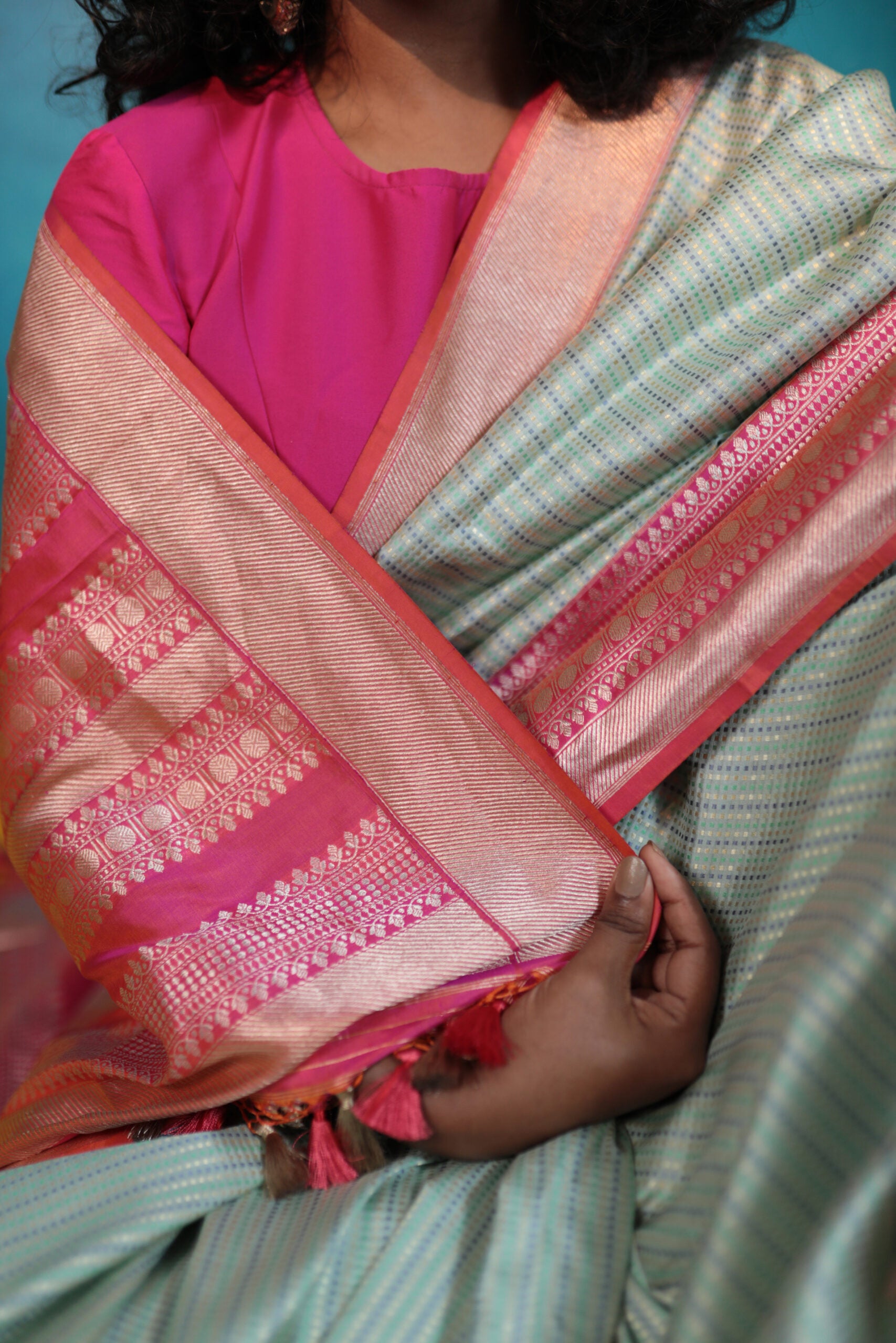 Sagarika a timeless creation crafted for your grand celebrations. This pure dobby weave striped katan silk saree, adorned with a striking contrast kadhiyal border, transforms every moment into a cherished memory. For the occasions that mean the most, let your drape tell a story of heritage and grace.